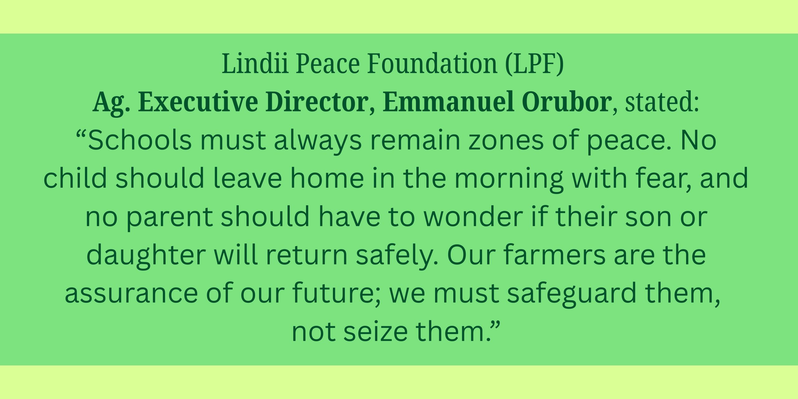 The Lindii Peace Foundation remains committed to protecting vulnerable populations across Nigeria. We stand firmly with the affected families, schools, communities, and state authorities during this painful time. We call for the immediate and unconditional release of all abducted students, teachers, and farmers.